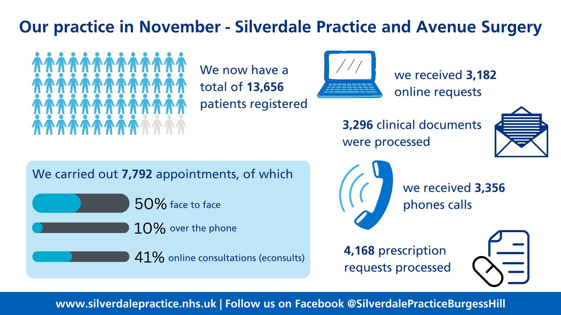 In November we supported thousands of patients across appointments, calls, prescriptions and online requests, and our team worked hard behind the scenes to keep everything running smoothly. Thank you to all our patients for working with us and helping us provide the best possible care.